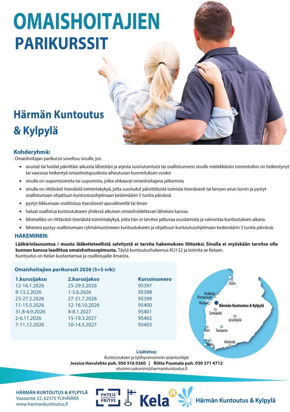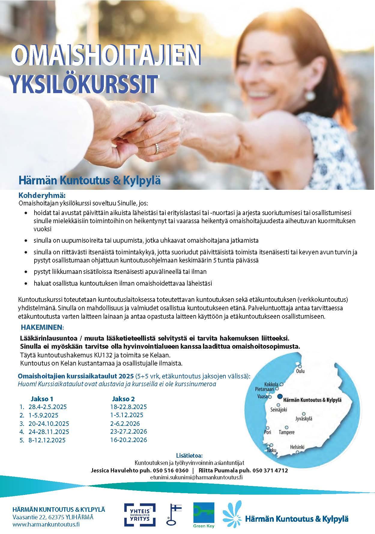 Kurssi on aikuista omaista/läheistä päivittäin hoitavalle omaishoitajalle, jolla on sairaudesta tai omaishoitajuudesta aiheutuvan rasituksen vuoksi vaikeuksia suoriutua arjesta tai osallisuutesi on alentunut tai vaarassa alentua. Tai on uupumisoireita, sairauksia tai muita tekijöitä, jotka uhkaavat omaishoitajana jaksamista. Kuntoutustarve on todettu terveydenhuollossa. Kunnallista omaishoitosopimusta ei tarvitse olla. Parikurssille omaishoidettava puoliso tai muu omaishoidettava aikuinen osallistuu kuntoutujan ohella kuntoutukseen.