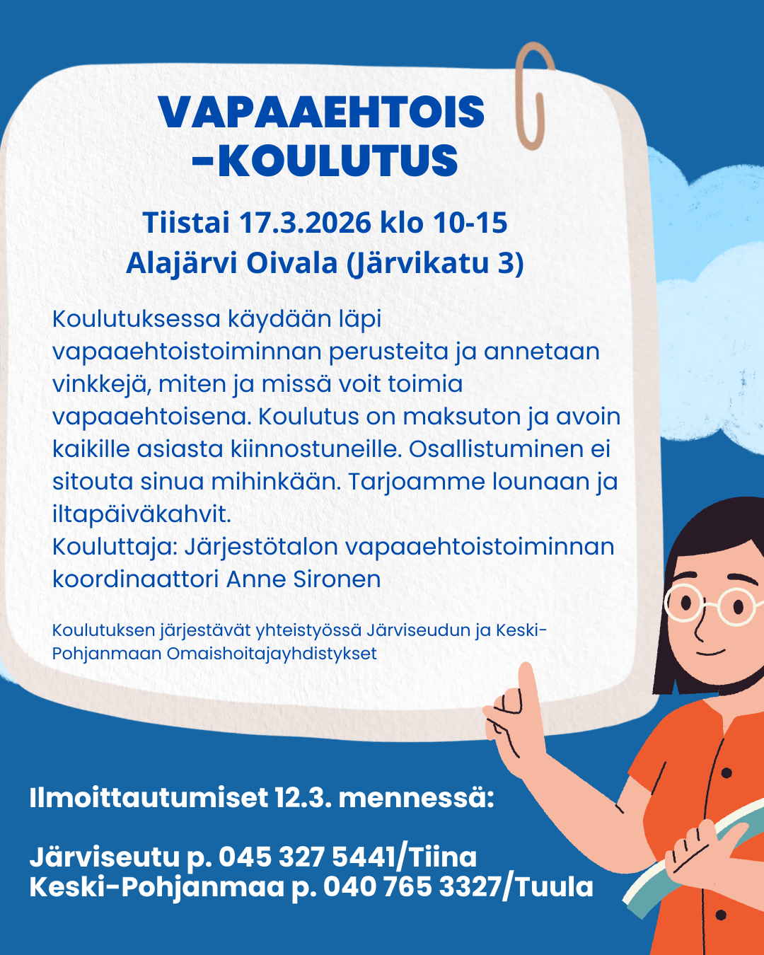 Koulutuksessa käydään läpi vapaaehtoistoiminnan perusteita ja annetaan vinkkejä, miten ja missä voit toimia vapaaehtoisena. Koulutus on maksuton ja avoin kaikille asiasta kiinnostuneille. Osallistuminen ei sitouta sinua mihinkään. Tarjoamme lounaan ja iltapäiväkahvit.