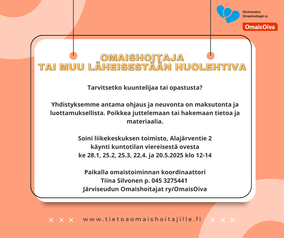 Paikka: Omaishoitajayhdistyksen toimisto Oivala, Järvikatu 3 A 2 (citykorttelin alapiha)