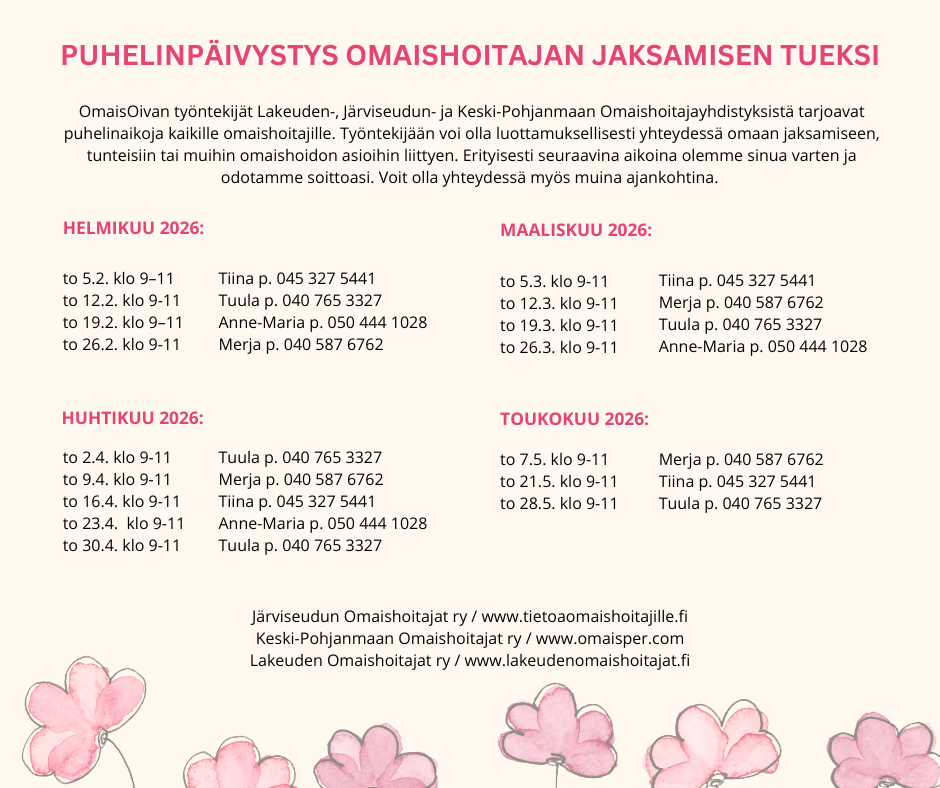 OmaisOivan työntekijät Lakeuden-, Järviseudun- ja Keski-Pohjanmaan Omaishoitajayhdistyksistä tarjoavat puhelinaikoja kaikille omaishoitajille.