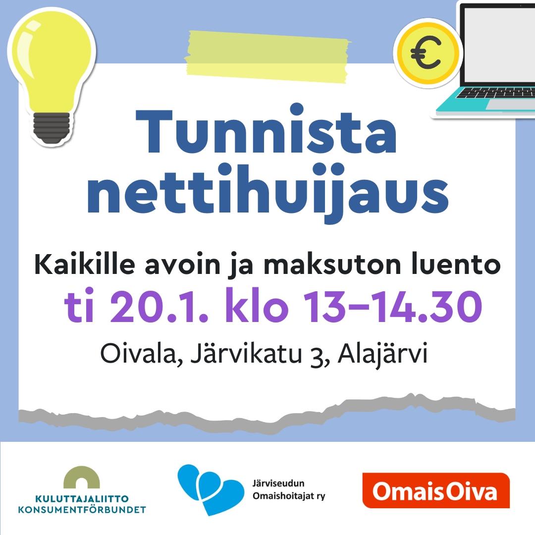 Luennolla käymme esimerkkien avulla läpi ajankohtaisia netti- ja puhelinhuijauksia ja niiden tunnusmerkkejä. Saat myös tietoa siitä, miten toimia, jos tulet huijatuksi.