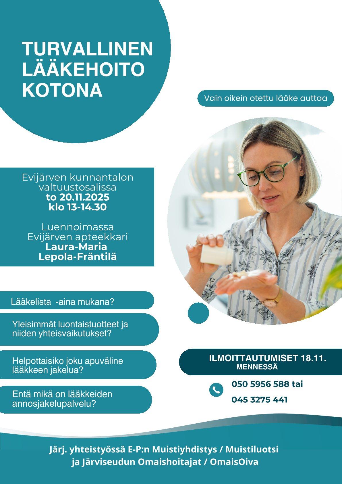 Aiheesta luennoimassa Evijärven apteekkari Laura-Maria Lepola-Fräntilä. Ilmoittautuminen 18.11. mennessä