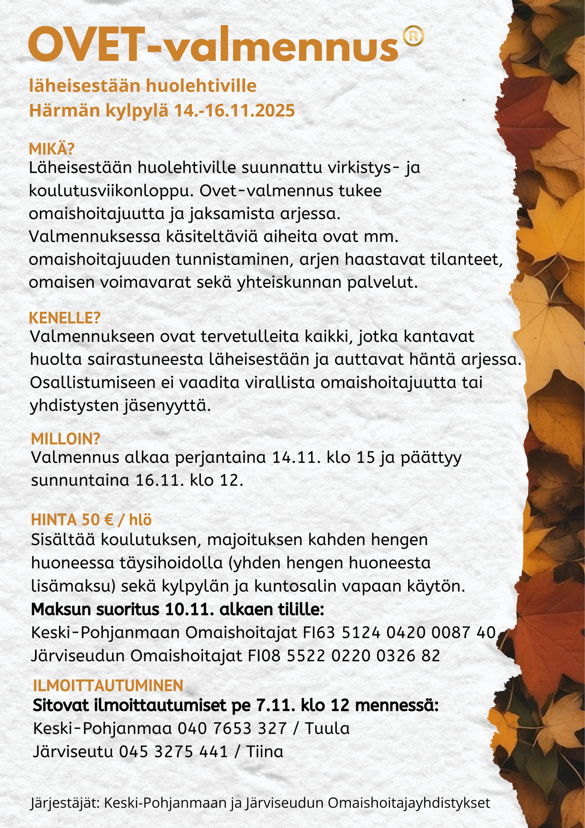 Lisätiedot ja ilmoittautumiset 17.10.2025 mennessä p. 045 3275441/Tiina.